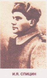 Спицын Иван Яковлевич находился в рядах Советской армии с ноября 1941 года по сентябрь 1946 года. Он был командиром отдельного взвода 45 миллиметровых пушек. При форсировании Днепра он проявил героизм и мужество и в октябре 1943 года был удостоен звания Героя Советского Союза. С левой стороны реки Днепра он уничтожил 3 пулемета противника, затем вслед за пехотой переправил свое орудие на правый берег Днепра и бил прямой наводкой по бегущему противнику. Уничтожил еще два пулемета противника. При переправе в 10-15 метрах от правого берега Днепра в плот попал немецкий снаряд. Спицын со своим расчетом вытащил пушку из воды. |